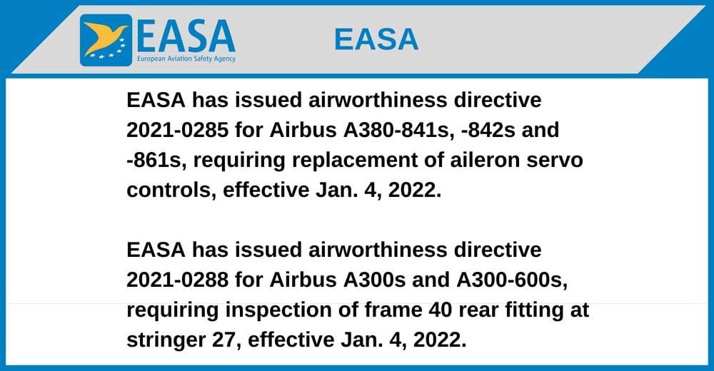 EASA has issued airworthiness directive 2021-0285 for Airbus A380-841s, -842s and -861s, requiring replacement of aileron servo controls, effective Jan. 4, 2022.