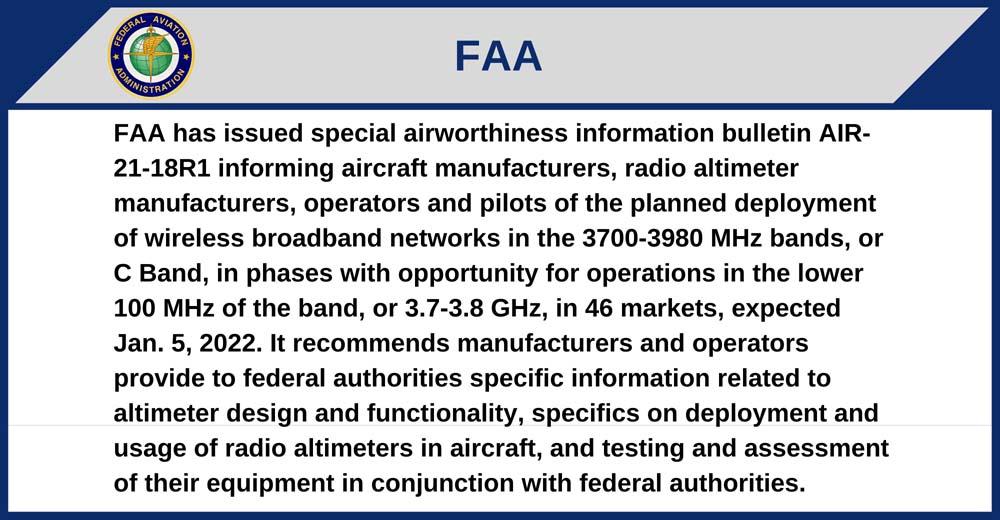 FAA has issued special airworthiness information bulletin AIR-21-18R1 informing aircraft manufacturers, radio altimeter manufacturers, operators and pilots of the planned deployment of wireless broadband networks in the 3700-3980 MHz bands, or C Band, in phases with opportunity for operations in the lower 100 MHz of the band, or 3.7-3.8 GHz, in 46 markets, expected Jan. 5, 2022. It recommends manufacturers and operators provide to federal authorities specific information related to altimeter design and functionality, specifics on deployment and usage of radio altimeters in aircraft, and testing and assessment of their equipment in conjunction with federal authorities.