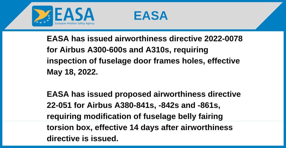 EASA has issued airworthiness directive 2022-0078 for Airbus A300-600s and A310s, requiring inspection of fuselage door frames holes, effective May 18, 2022.