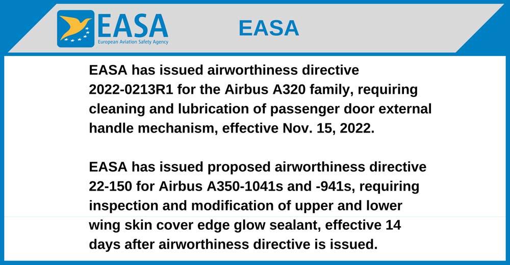 EASA has issued airworthiness directive 2022-0213R1 for the Airbus A320 family, requiring cleaning and lubrication of passenger door external handle mechanism, effective Nov. 15, 2022.
