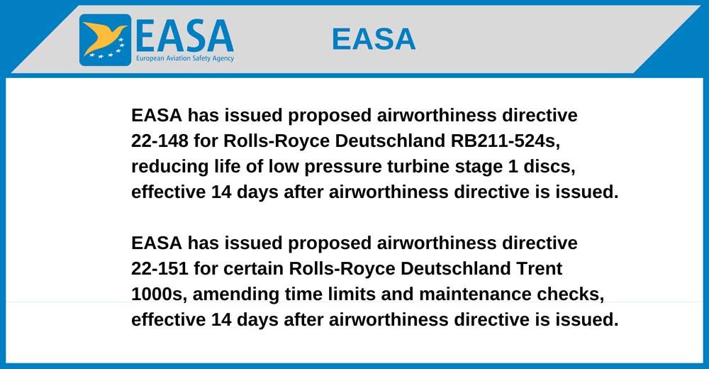 EASA has issued proposed airworthiness directive 22-148 for Rolls-Royce Deutschland RB211-524s, reducing life of low pressure turbine stage 1 discs, effective 14 days after airworthiness directive is issued.