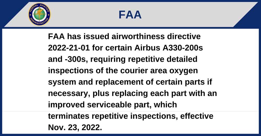FAA has issued airworthiness directive 2022-21-01 for certain Airbus A330-200s and -300s, requiring repetitive detailed inspections of the courier area oxygen system and replacement of certain parts if necessary, plus replacing each part with an improved serviceable part, which terminates repetitive inspections, effective Nov. 23, 2022.