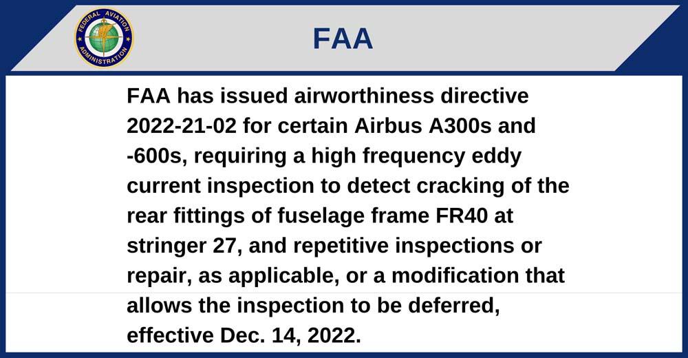FAA has issued airworthiness directive 2022-21-02 for certain Airbus A300s and -600s, requiring a high frequency eddy current inspection to detect cracking of the rear fittings of fuselage frame FR40 at stringer 27, and repetitive inspections or repair, as applicable, or a modification that allows the inspection to be deferred, effective Dec. 14, 2022.