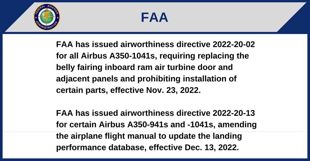 FAA has issued airworthiness directive 2022-20-02 for all Airbus A350-1041s, requiring replacing the belly fairing inboard ram air turbine door and adjacent panels and prohibiting installation of certain parts, effective Nov. 23, 2022.
