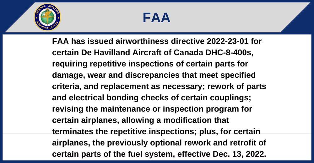 FAA has issued airworthiness directive 2022-23-01 for certain De Havilland Aircraft of Canada DHC-8-400s, requiring repetitive inspections of certain parts for damage, wear and discrepancies that meet specified criteria, and replacement as necessary; rework of parts and electrical bonding checks of certain couplings; revising the maintenance or inspection program for certain airplanes, allowing a modification that terminates the repetitive inspections; plus, for certain airplanes, the previously optional rework and retrofit of certain parts of the fuel system, effective Dec. 13, 2022.