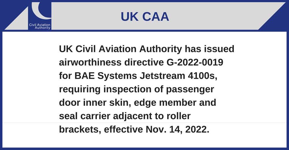 UK Civil Aviation Authority has issued airworthiness directive G-2022-0019 for BAE Systems Jetstream 4100s, requiring inspection of passenger door inner skin, edge member and seal carrier adjacent to roller brackets, effective Nov. 14, 2022.