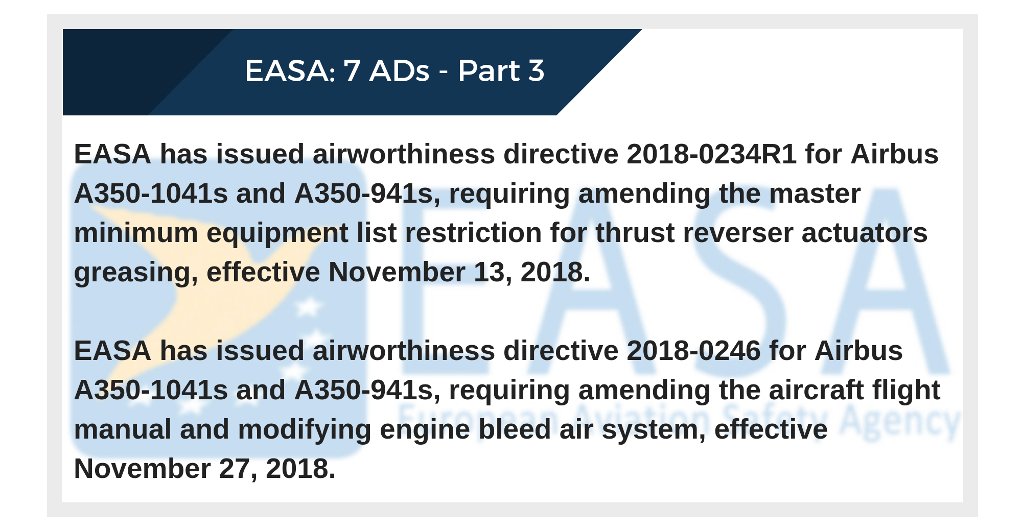 EASA has issued airworthiness directive 2018-0234R1 for Airbus A350-1041s and A350-941s, requiring amending the master minimum equipment list restriction for thrust reverser actuators greasing, effective November 13, 2018.