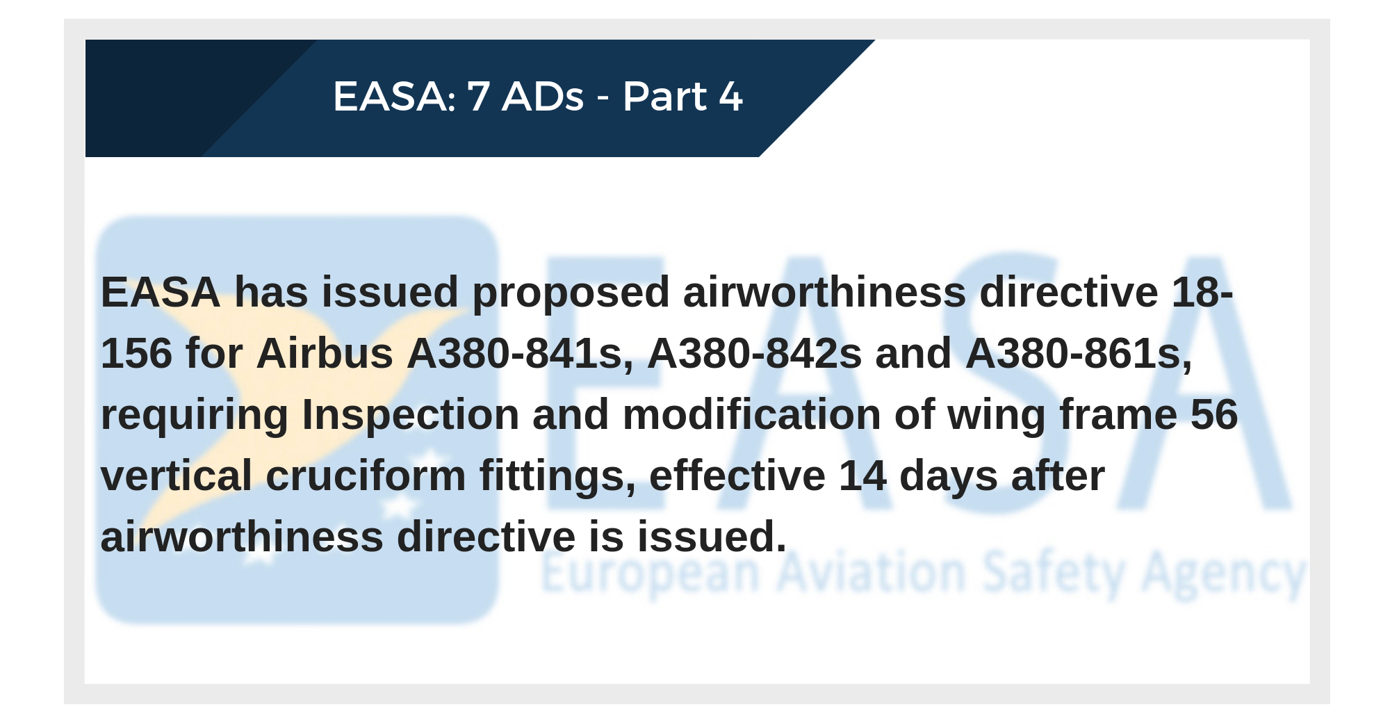 EASA has issued proposed airworthiness directive 18-156 for Airbus A380-841s, A380-842s and A380-861s, requiring Inspection and modification of wing frame 56 vertical cruciform fittings, effective 14 days after airworthiness directive is issued.