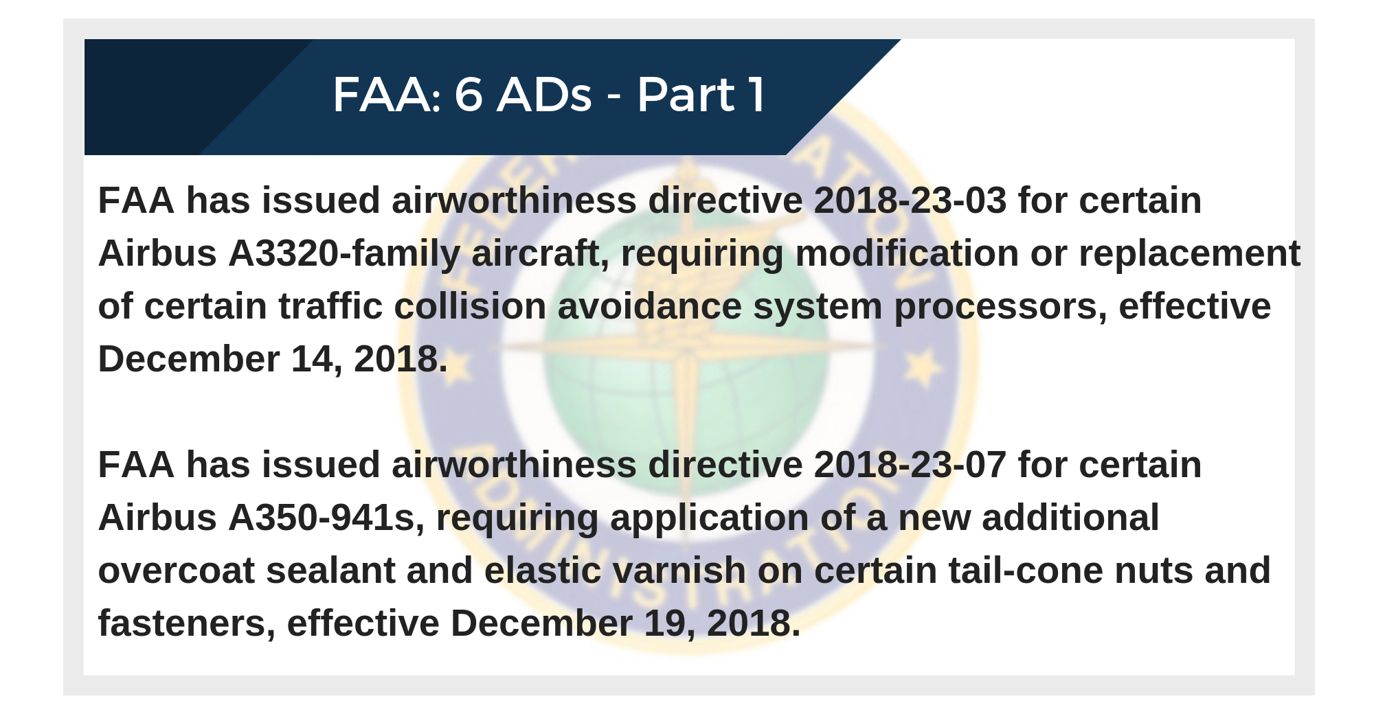 FAA has issued airworthiness directive 2018-23-03 for certain Airbus A3320-family aircraft, requiring modification or replacement of certain traffic collision avoidance system processors, effective December 14, 2018.