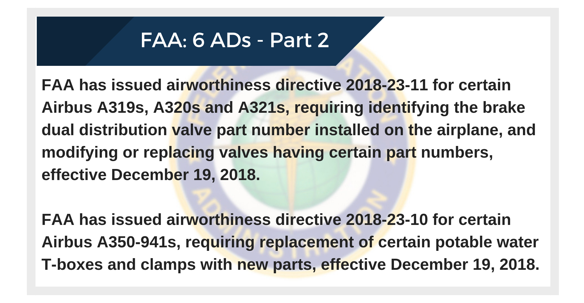 FAA has issued airworthiness directive 2018-23-10 for certain Airbus A350-941s, requiring replacement of certain potable water T-boxes and clamps with new parts, effective December 19, 2018.
