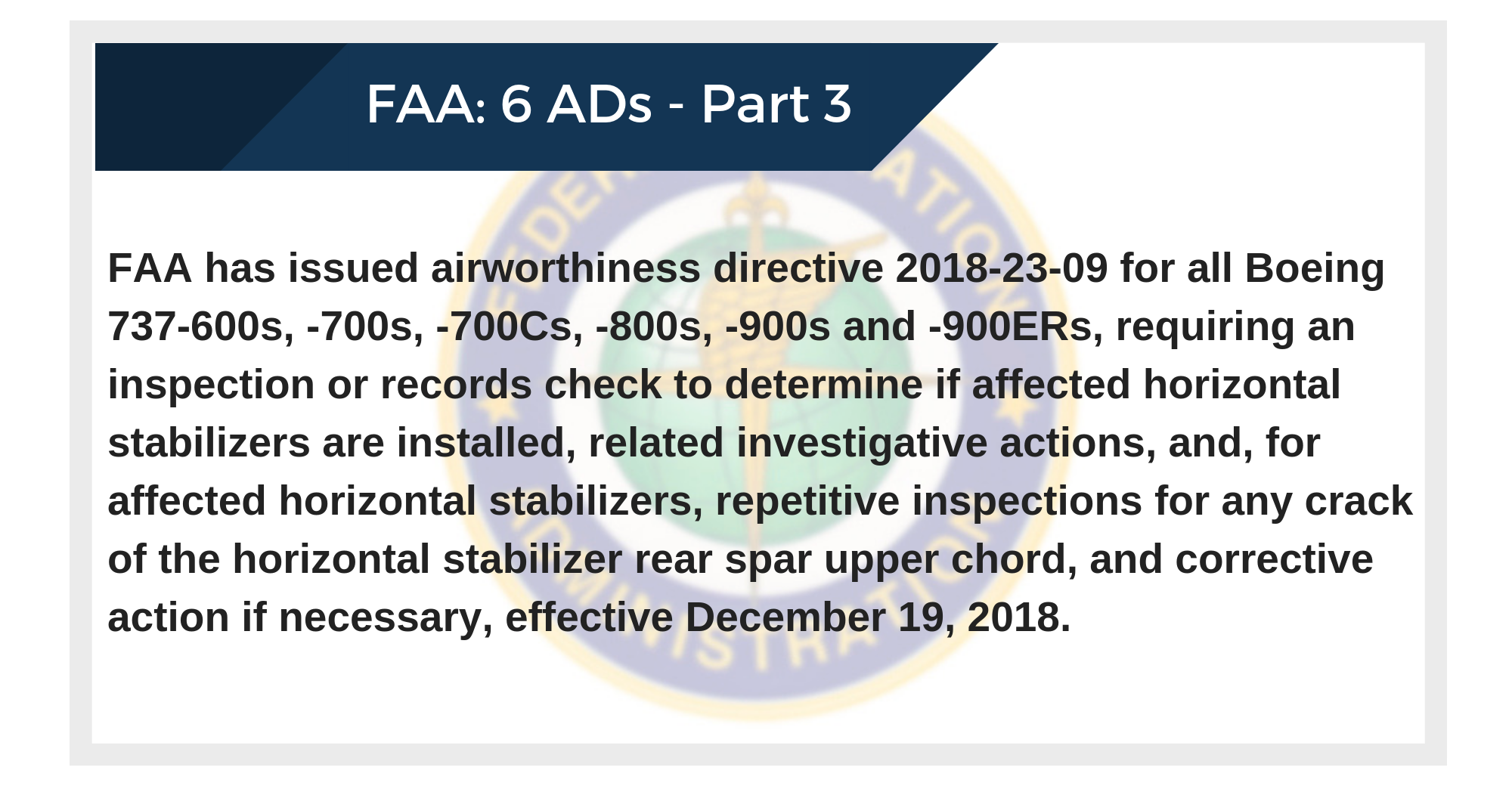 FAA has issued airworthiness directive 2018-23-09 for all Boeing 737-600s, -700s, -700Cs, -800s, -900s and -900ERs, requiring an inspection or records check to determine if affected horizontal stabilizers are installed, related investigative actions, and, for affected horizontal stabilizers, repetitive inspections for any crack of the horizontal stabilizer rear spar upper chord, and corrective action if necessary, effective December 19, 2018.