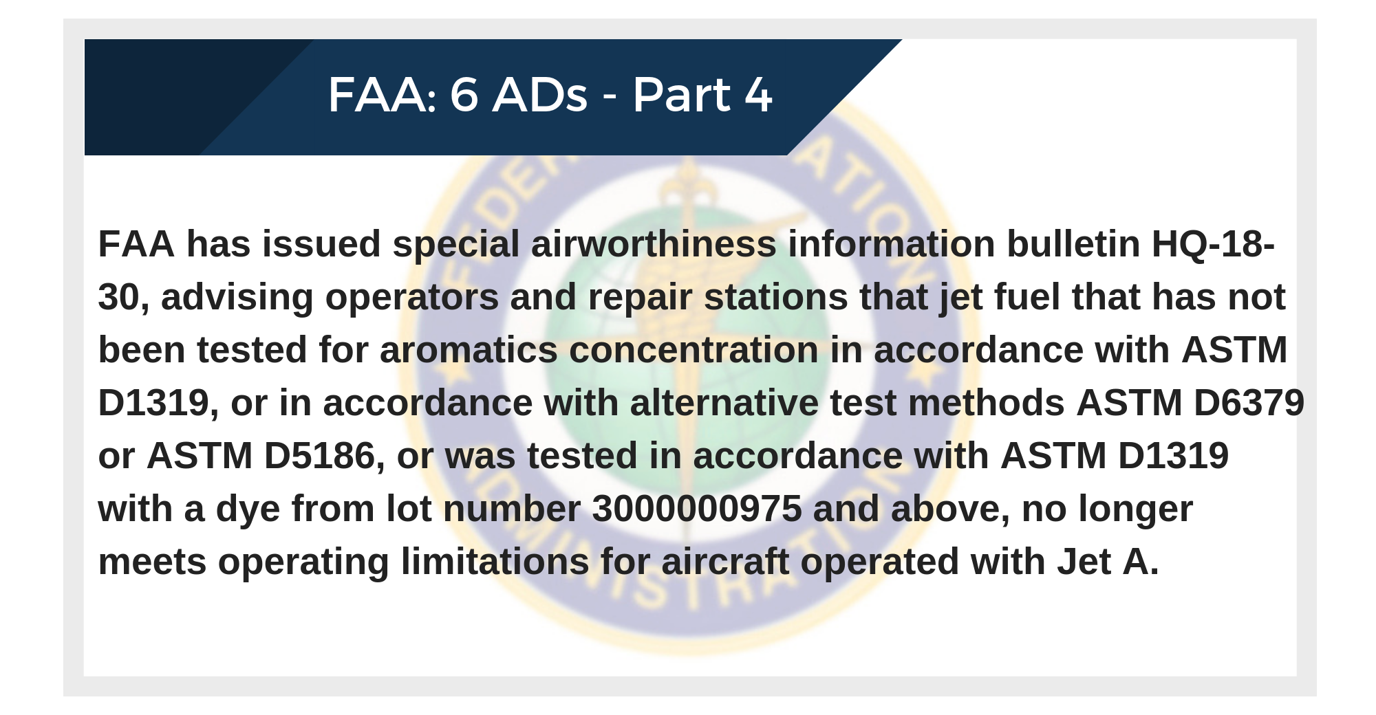FAA has issued special airworthiness information bulletin HQ-18-30, advising operators and repair stations that jet fuel that has not been tested for aromatics concentration in accordance with ASTM D1319, or in accordance with alternative test methods ASTM D6379 or ASTM D5186, or was tested in accordance with ASTM D1319 with a dye from lot number 3000000975 and above, no longer meets operating limitations for aircraft operated with Jet A.
