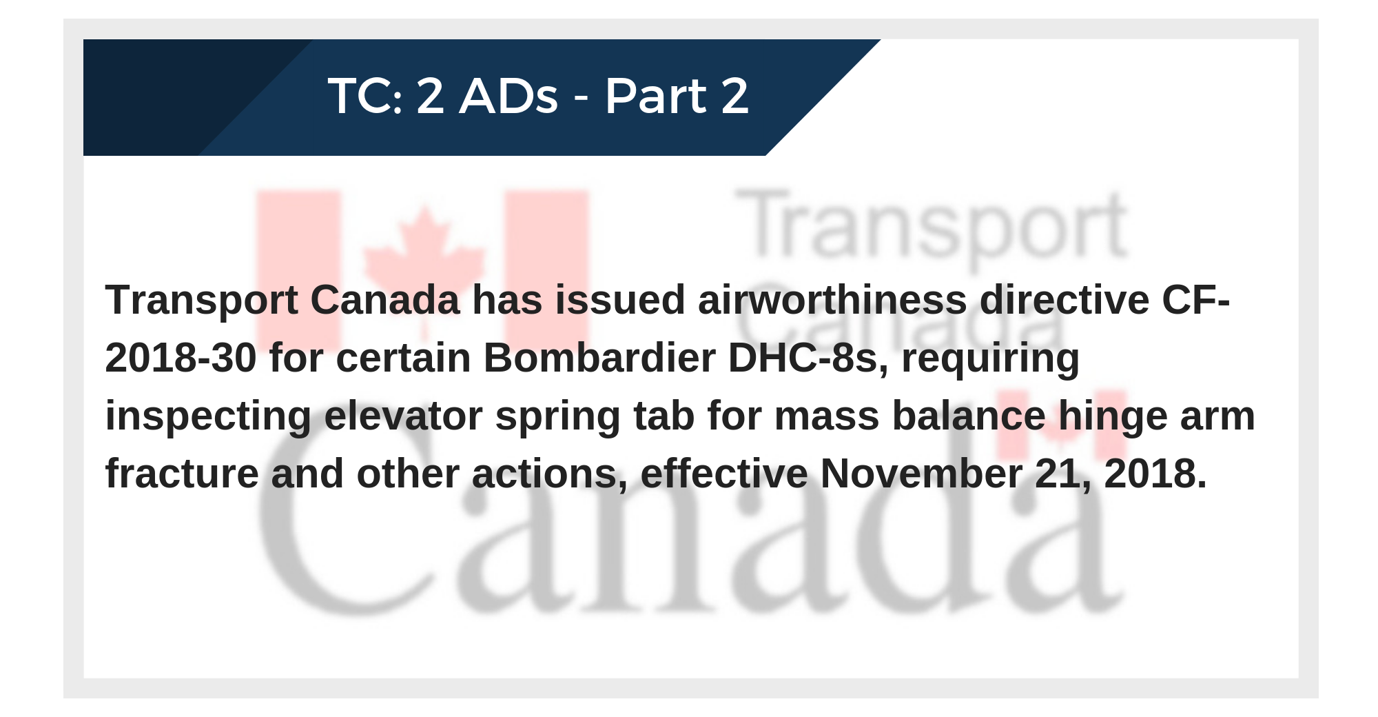 Transport Canada has issued airworthiness directive CF-2018-30 for certain Bombardier DHC-8s, requiring inspecting elevator spring tab for mass balance hinge arm fracture and other actions, effective November 21, 2018.