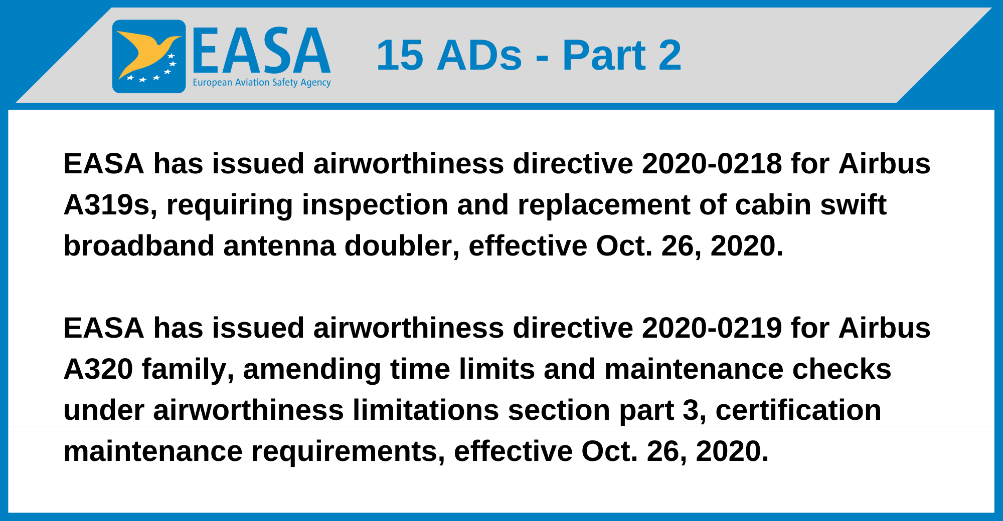EASA has issued airworthiness directive 2020-0218 for Airbus A319s, requiring inspection and replacement of cabin swift broadband antenna doubler, effective Oct. 26, 2020.