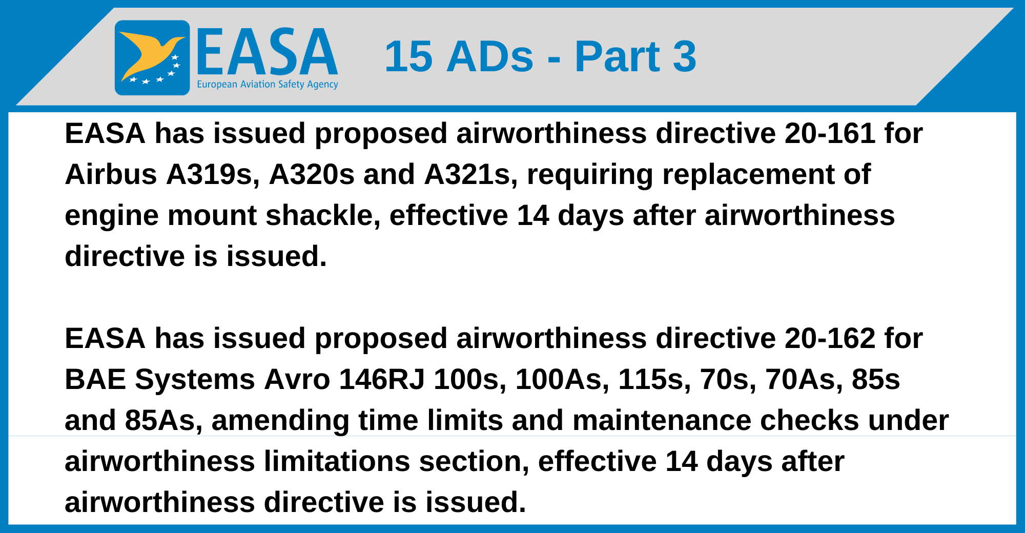 EASA has issued proposed airworthiness directive 20-161 for Airbus A319s, A320s and A321s, requiring replacement of engine mount shackle, effective 14 days after airworthiness directive is issued.