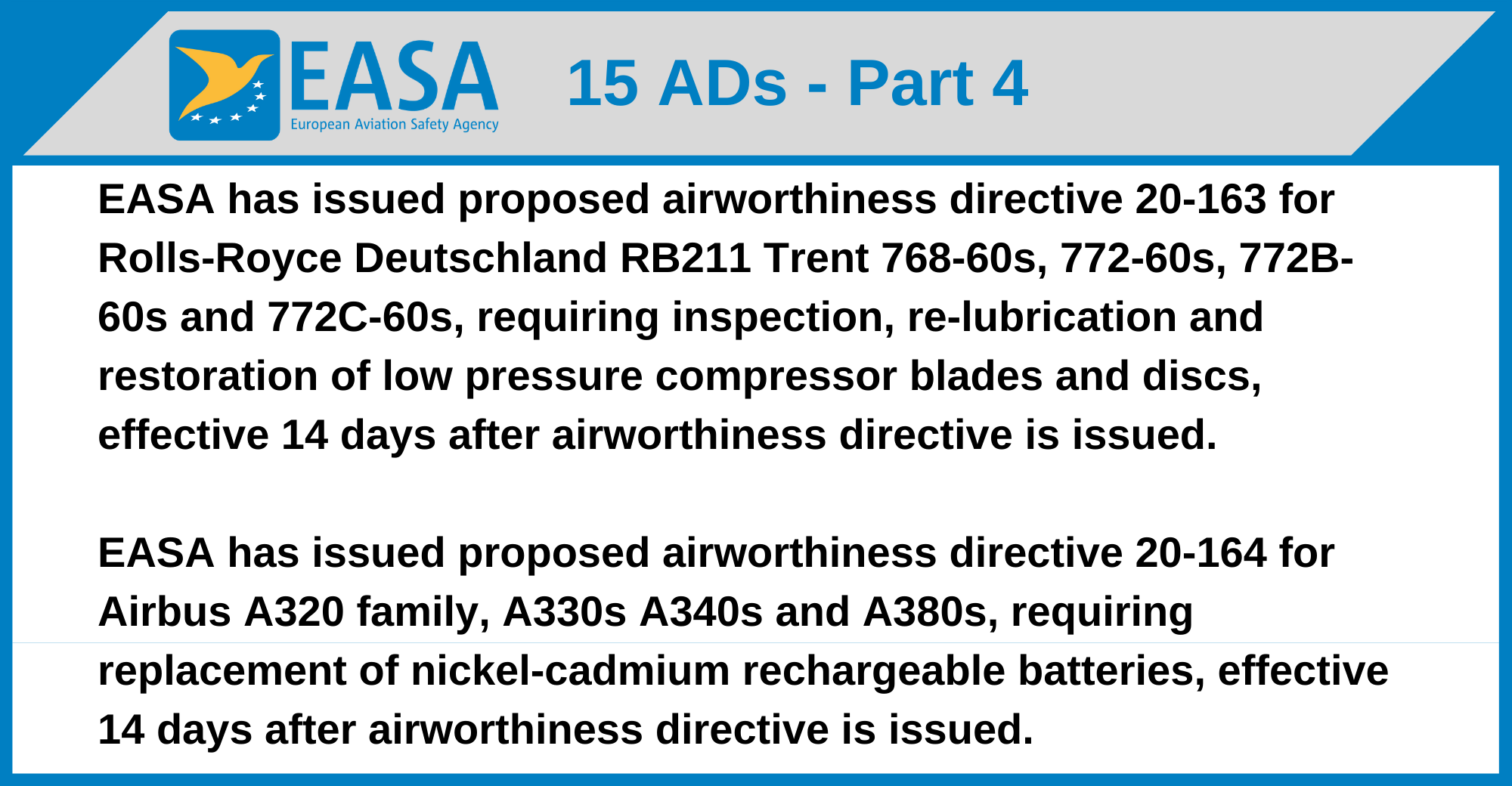 EASA has issued proposed airworthiness directive 20-164 for Airbus A320 family, A330s A340s and A380s, requiring replacement of nickel-cadmium rechargeable batteries, effective 14 days after airworthiness directive is issued.