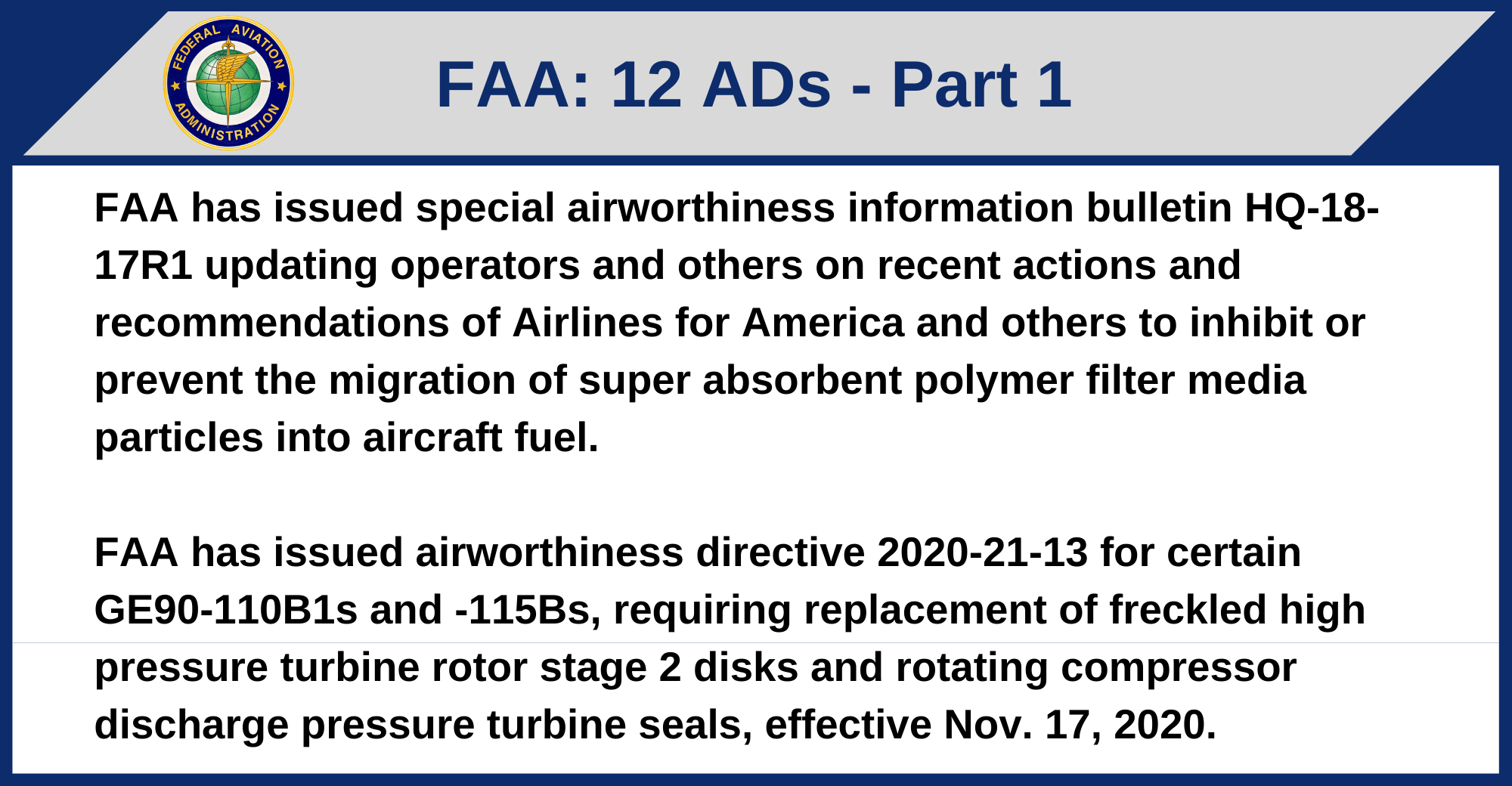 FAA has issued airworthiness directive 2020-21-13 for certain GE90-110B1s and -115Bs, requiring replacement of freckled high pressure turbine rotor stage 2 disks and rotating compressor discharge pressure turbine seals, effective Nov. 17, 2020.