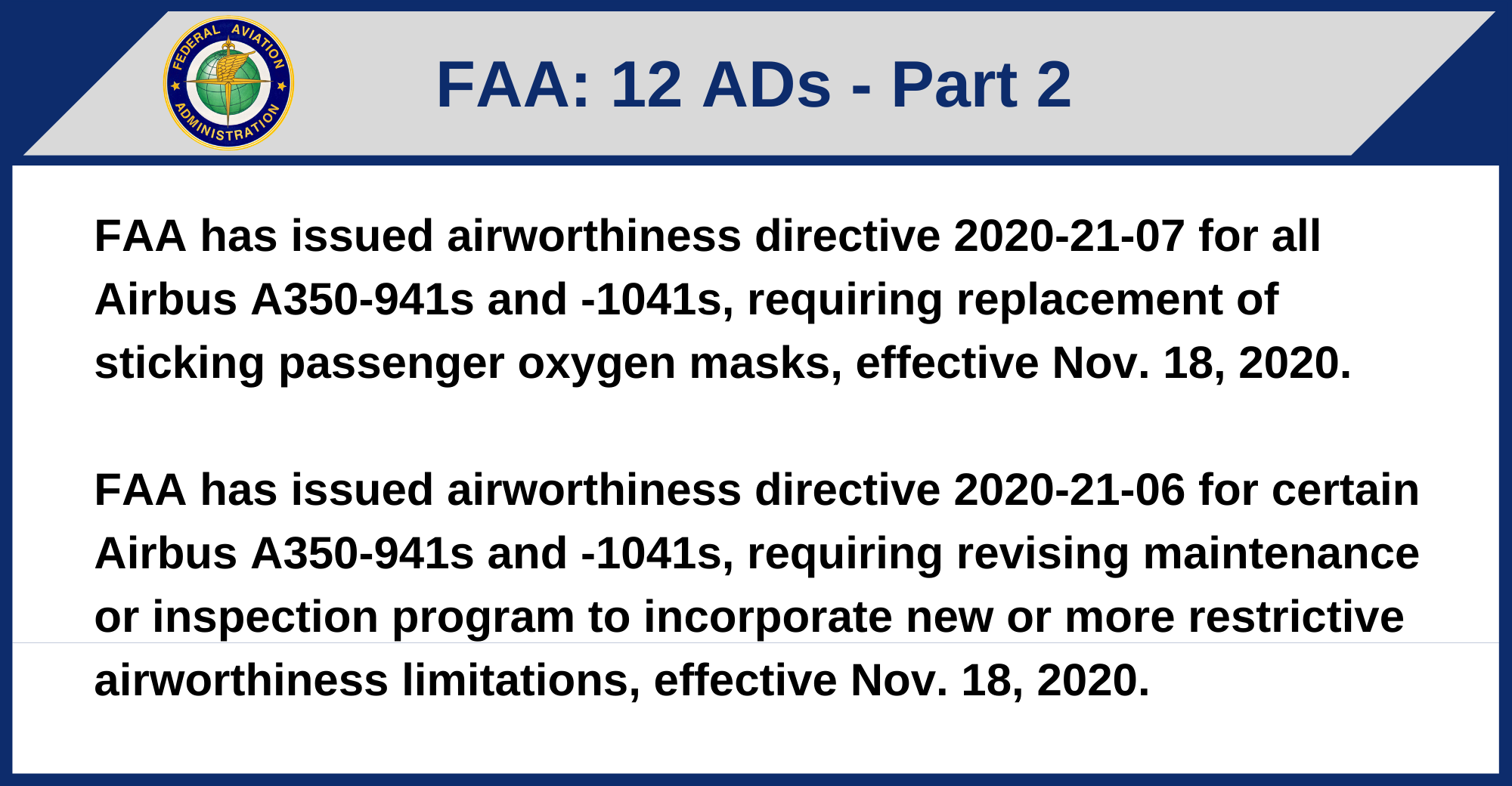 FAA has issued airworthiness directive 2020-21-07 for all Airbus A350-941s and -1041s, requiring replacement of sticking passenger oxygen masks, effective Nov. 18, 2020.