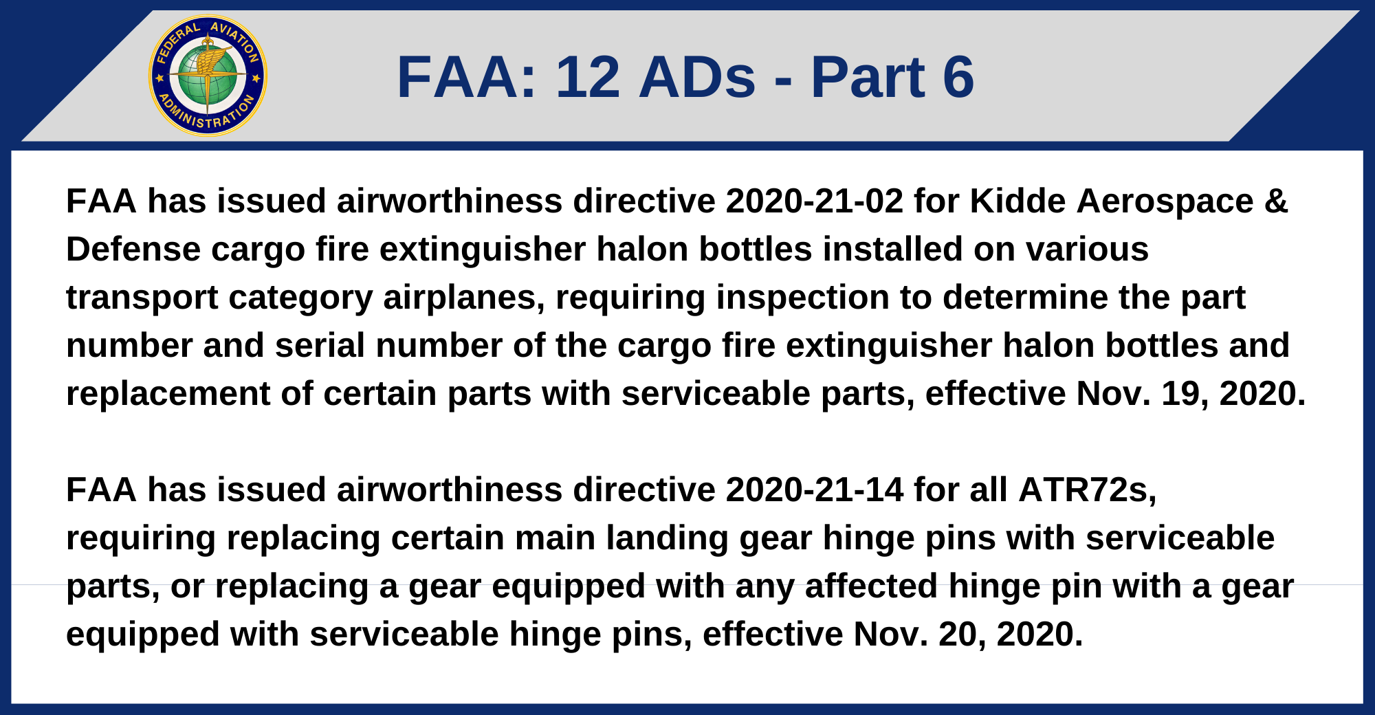 FAA has issued airworthiness directive 2020-21-14 for all ATR72s, requiring replacing certain main landing gear hinge pins with serviceable parts, or replacing a gear equipped with any affected hinge pin with a gear equipped with serviceable hinge pins, effective Nov. 20, 2020.