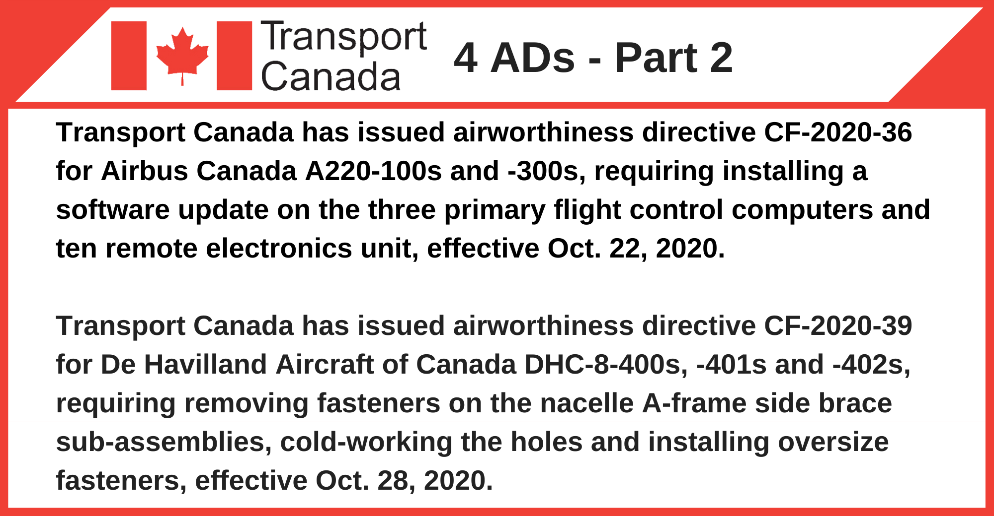 Transport Canada has issued airworthiness directive CF-2020-36 for Airbus Canada A220-100s and -300s, requiring installing a software update on the three primary flight control computers and ten remote electronics unit, effective Oct. 22, 2020.
