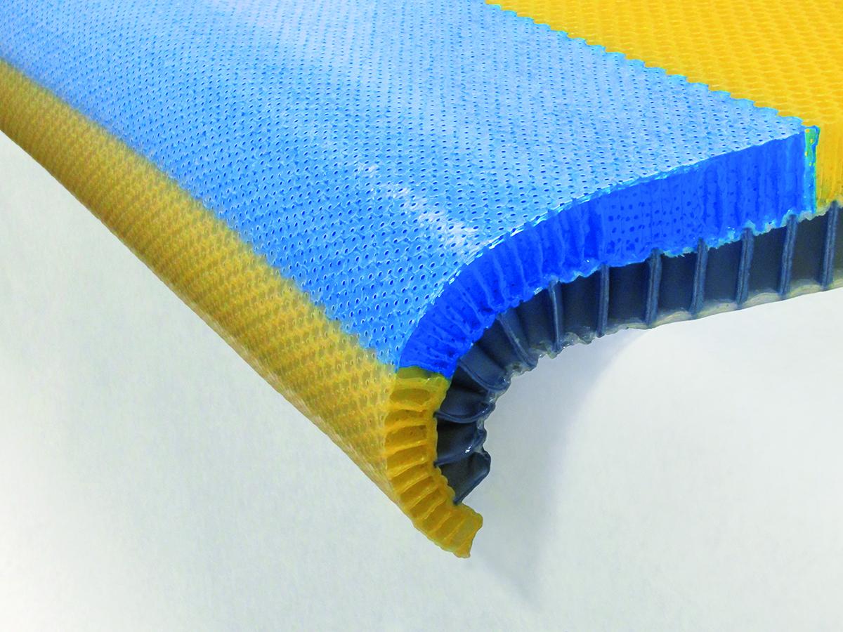 By adding perforations in the cell walls of the Stimulite seat, air circulates and moisture evaporates, which optimizes long-term sitting. The material is also compliant with fire, smoke and toxicity requirements for 14 CFR Part 25 and corresponding OEM specifications. Non-halogenated flame-retardant technology is one benefit of the TPU material.