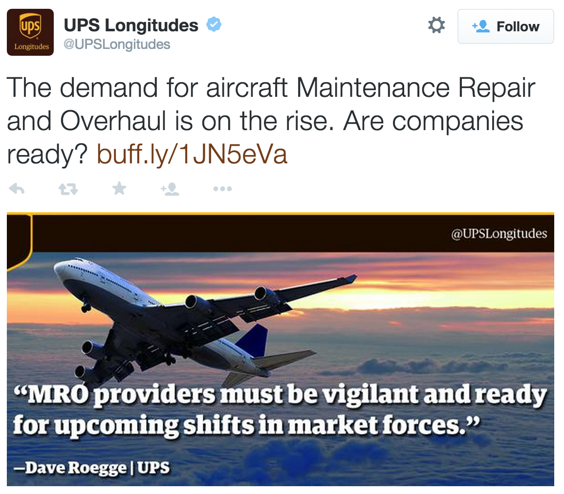UPS tweets a blog on the MRO industry entitled, “Challenges, Opportunities in Shifting Aerospace MRO Landscape.”