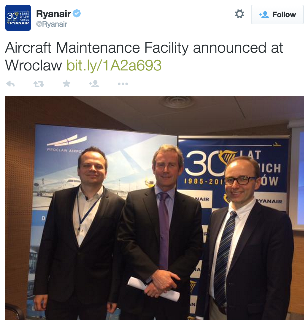 RyanAir announced it would open its first Polish C-check maintenance base at Wroclaw Airport in March 2016.