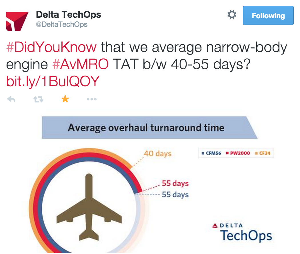 Delta TechOps tweets a fact about the average overhaul turnaround time.