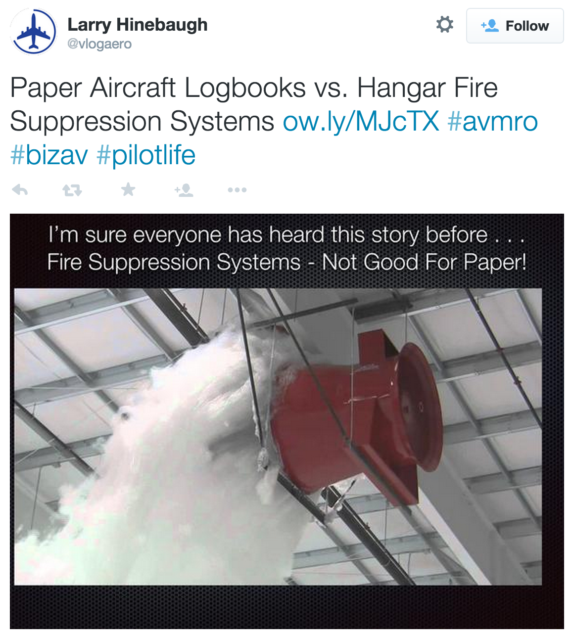 Larry Hinebaugh tweets a new blog post on hangar fire suppression systems and paper logbooks. The blog addresses the questions of where to keep paper logbooks with the risk of fire in aircraft hangars.