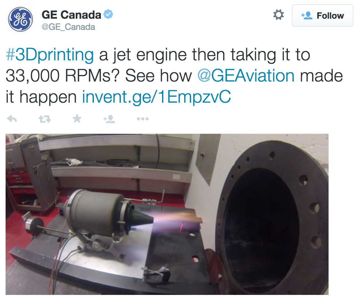 GE Canada tweeted a blog post on how engineers 3D printed a mini jet engine and brought it to 33,000 RPM.