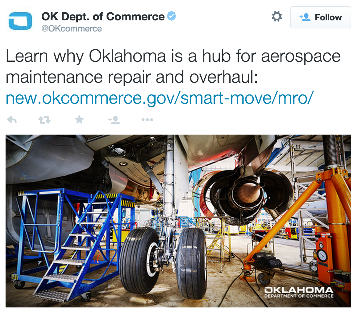 Oklahoma Department of Commerce tweets a blog post on why Oklahoma is a great place for MRO facilities.
