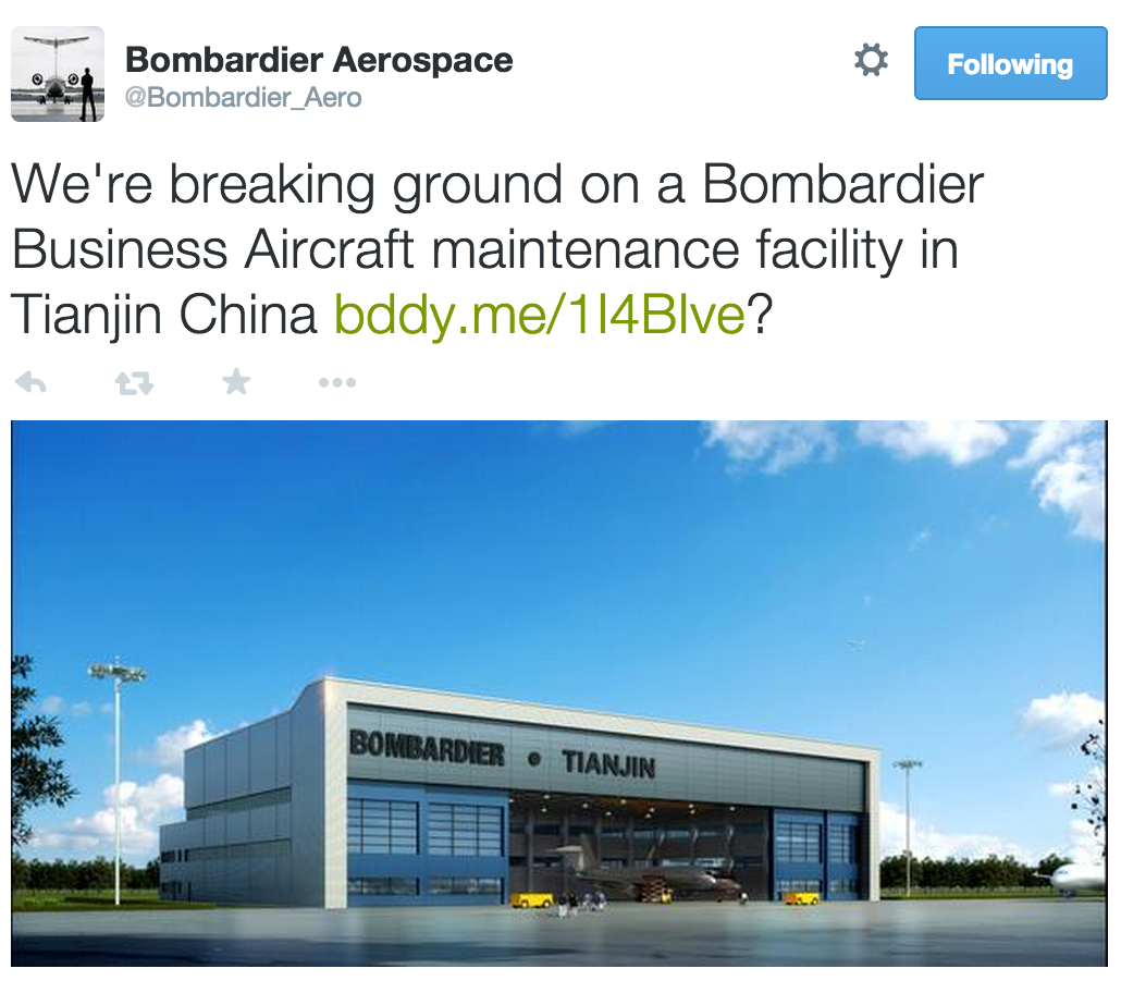 Bombardier Aerospace breaks ground at its new maintenance facility in Tianjin, China.