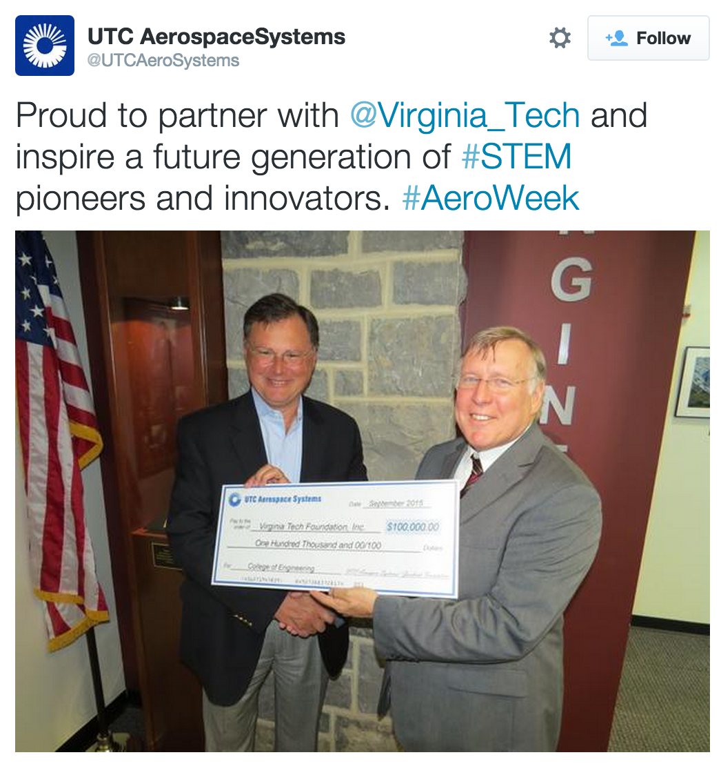 UTC Aerospace Systems donates to Virginia Tech for future generations of STEM students.