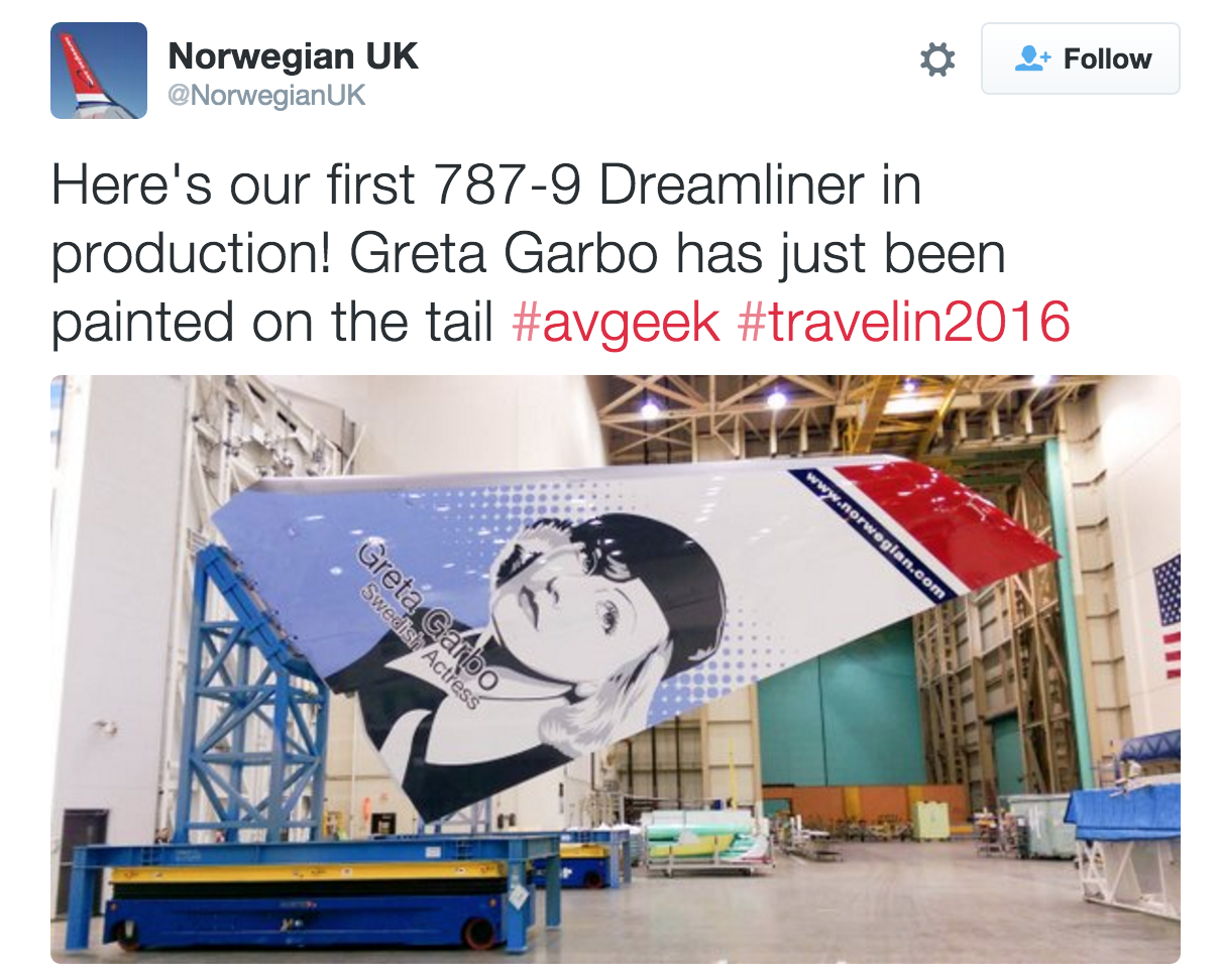 Norwegian Air posts a photo of Greta Garbo painted on a 787-9 Dreamliner.