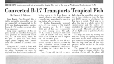 Tropical fish, a highly perishable commodity, are being transported to the U.S. from South America in a wartime Boeing B-17G converted into a flying aquarium.