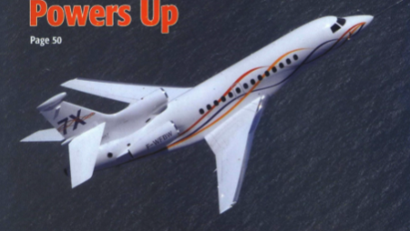 The cover of the May 16, 2005 features a Dassault Falcon 7X flying over water after taking off from the company's airfield in Bordeaux, France.