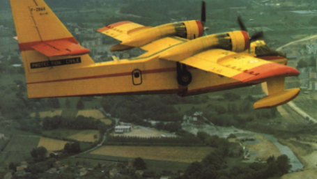 A piston engine-powered Canadair CL-215 water bomber is shown in flight over Marseilles, France. It is one of four being used in France to fight fires and six more CL-215s have been ordered Stone structure visible below is ancient Roman viaduct still in use.