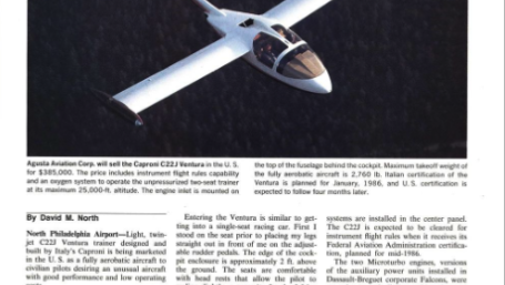 Our very own David M. North took the controls of this light twinjet C22J Ventura trainer. Read his pilot report on the aerobatic performance of the C22J Ventura from the December 16, 1985 issue of Aviation Week & Space Technology.
