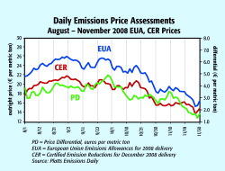 The price of EU emission allowances (EUAs) under the EU Emissions Trading Scheme fell for most of November, before finding support in the latter half of the month as oil prices began to stabilize. EUAs for December 2008 delivery held broadly steady in the first few days of November, holding mostly...
