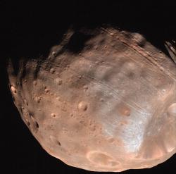 The Martian moon Phobos, imaged in color for the first time by Mars Reconnaissance Orbiter (MRO), reveals distinctive red material like that on the Martian surface. This could mean that Mars material, blasted into space by meteorites, has collected on Phobos. It would be much easier for a sample...