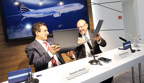 Panama City-based Copa Airlines will convert 15 previously ordered Boeing 737 MAX aircraft to the new MAX 10 version, the company said at the Paris Air show June 21. Copa will become the first airline to operate the 737 MAX 10 in Latin America.Pictured: From left: Boeing Commercial Airplanes SVP-global sales & marketing Ihssane Mounir and Copa Airlines VP-technical operations Ahmad Zamany.