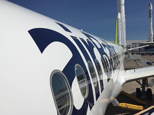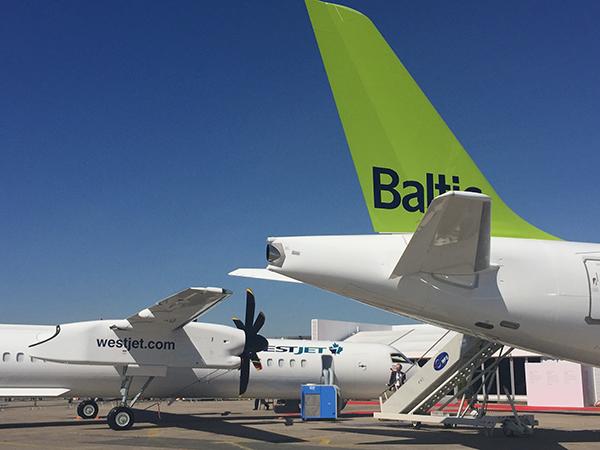 An AirBaltic Bombardier CSeries aircraft in the Paris static park.