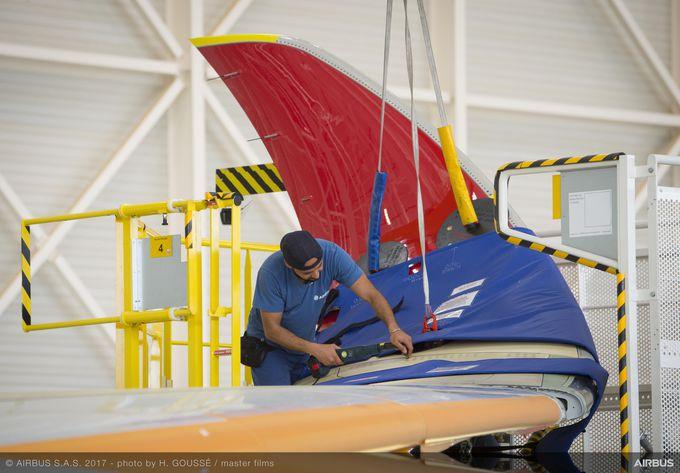 Airbus has completed the wing-fuselage junction and has installed the tailplane and tailcone on Air Mauritius’ first A350-900, which is on schedule to deliver in the fourth quarter.