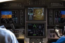 The standard Honeywell Primus Apex avionics package features three, eight-by-10-inch Barco AMLCD displays, with an optional fourth screen installed as the copilot's PFD. The system uses hub-and-spoke architecture, with a 12-slot Primus Epic modular avionics unit installed below the center aisle...