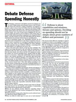 The editorial “Debate Defense Spending Honestly” (AW&ST Nov. 14, p. 66) makes excellent points, but does not sufficiently address our military bloat. We can safely shift $300 billion a year from the defense budget to NASA and infrastructure development, and still maintain a robust military. Sure...