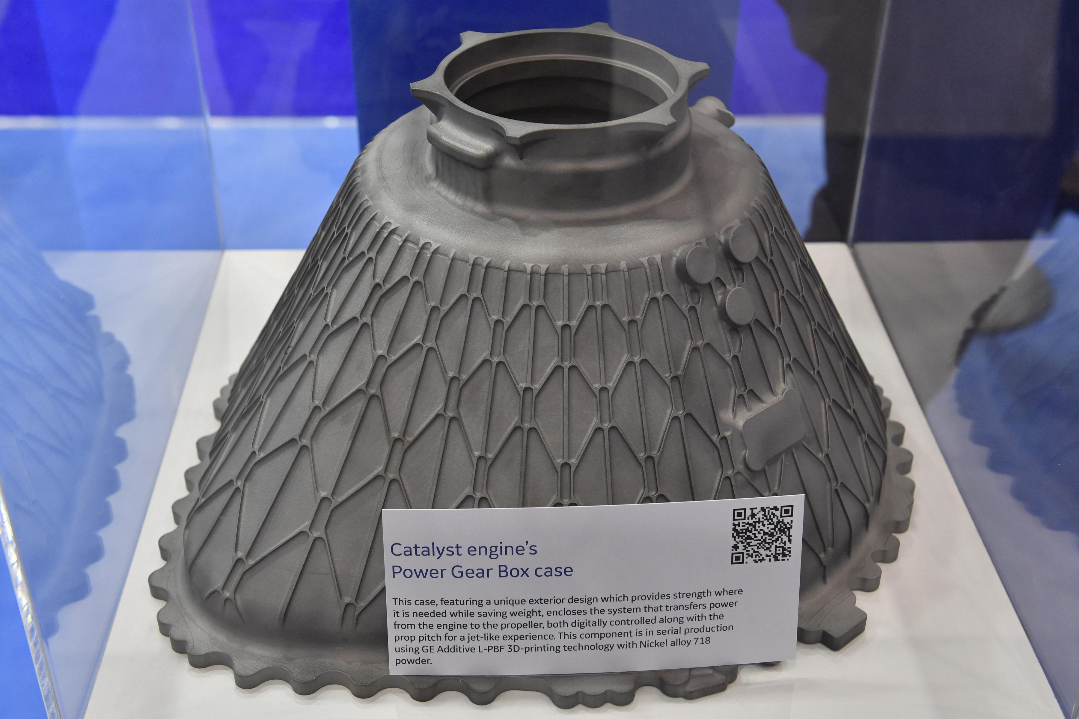 The General Electric Catalyst’s power gearbox case is 3D printed from nickel alloy 718. Credit: Mark Wagner/Aviation Images