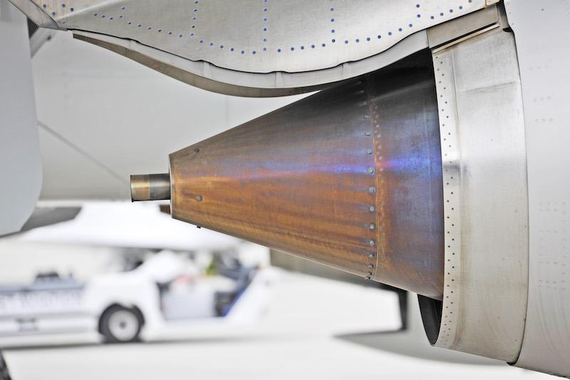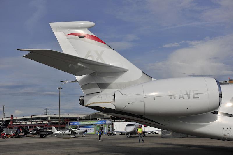 An aft view of the Comlux TwoTwenty ACJ provides an interesting perspective on the distinctive exhaust nozzle of the aircraft's Pratt & Whitney PW1500G engine.
