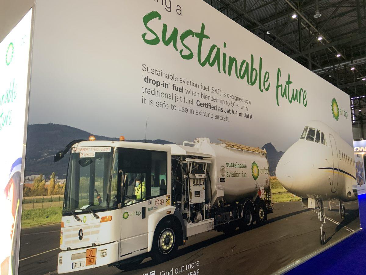 Air BP offers up to a 50/50 blend of sustainable aviation fuel (SAF) on Booth B55. SAF is produced from sustainable, renewable feedstocks and is very similar in its chemistry to fossil jet fuel, but yields a reduction in CO2 emissions. Credit: Aviation Week/Lee Ann Shay
