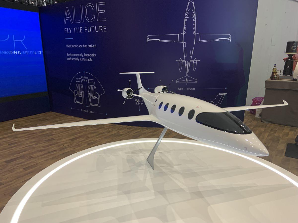 Nothing daunted, Eviation’s Alice electric aircraft on Booth IZ07 is a model, the unflown prototype having been damaged by a battery fire over two years ago. Credit: Aviation Week/Lee Ann Shay