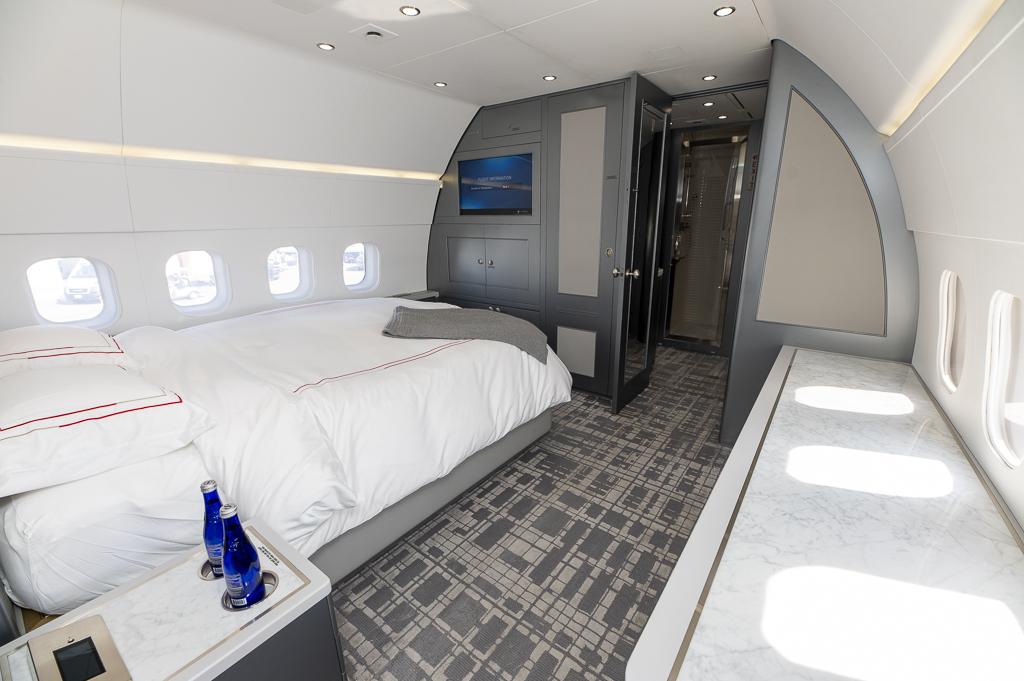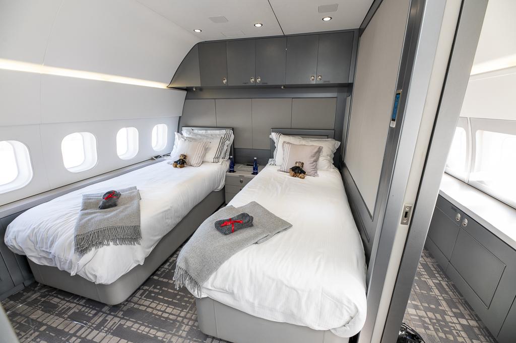 One of the two bedroom suites on the Opus Aero BBJ. This one features two single sleeping beds and a private bath with a shower.